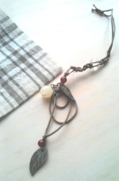 前に買った材料で作ってみたのですが、最初はネックレスにしようか迷っていたので、本来のストラップの作り方とは違い、上のわっかができなかったので結びました。